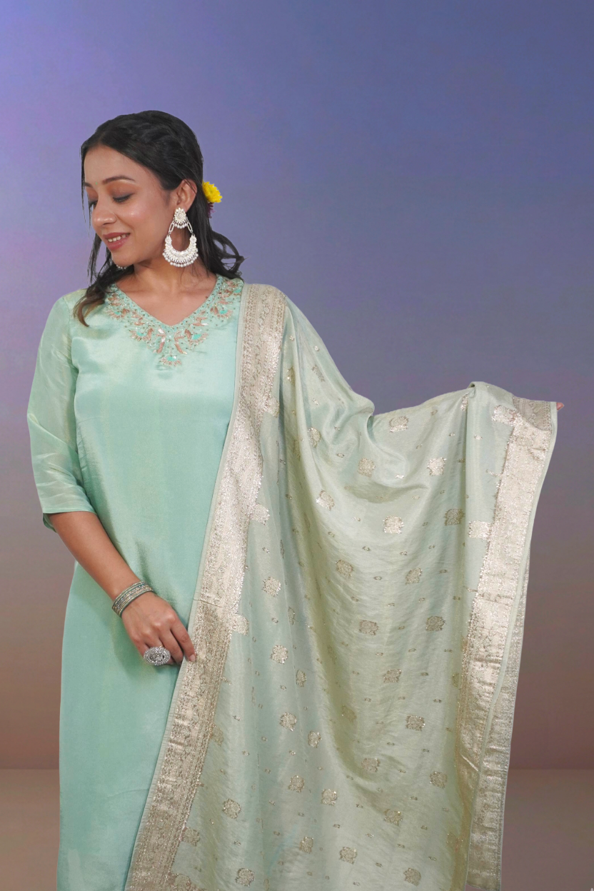 Mint Green Hand-Embroidered Kurta Set with Zari Dupatta