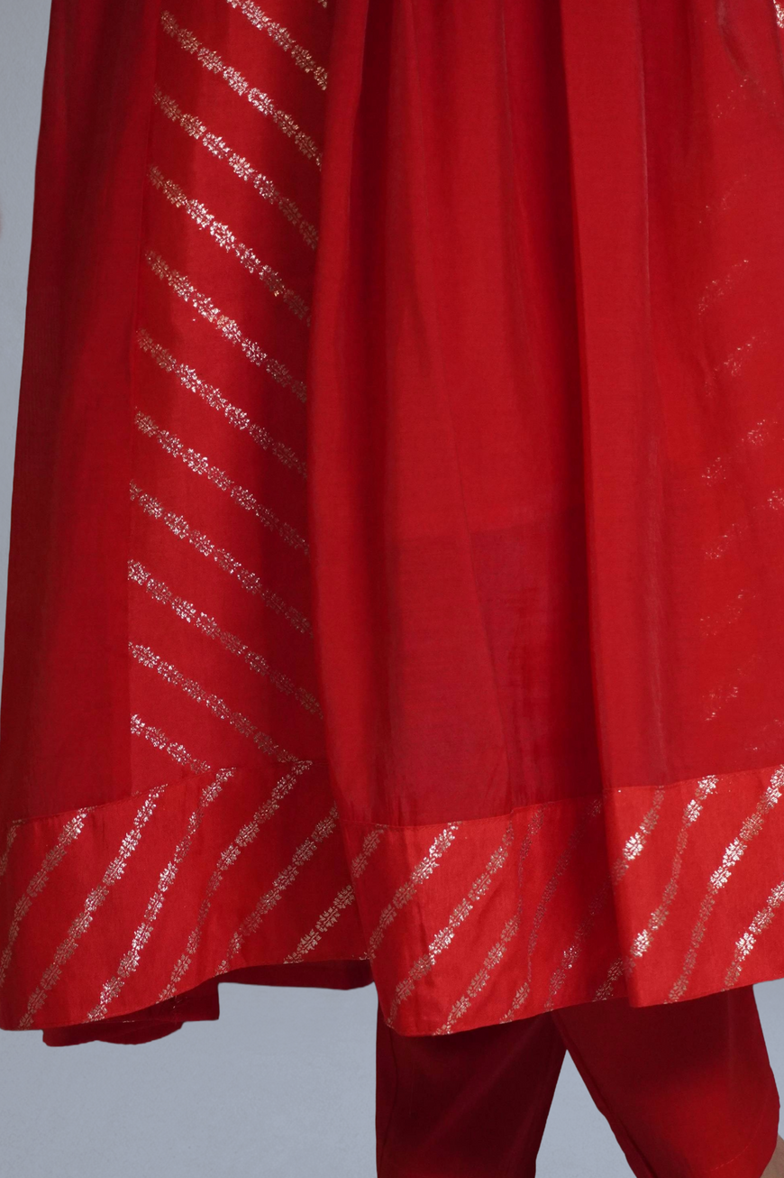 The rich red fabric is beautifully accented with intricate gold diagonal stripes (Leheriya style) that add a sense of height and fluid movement to the garment.