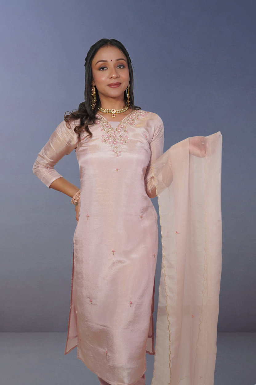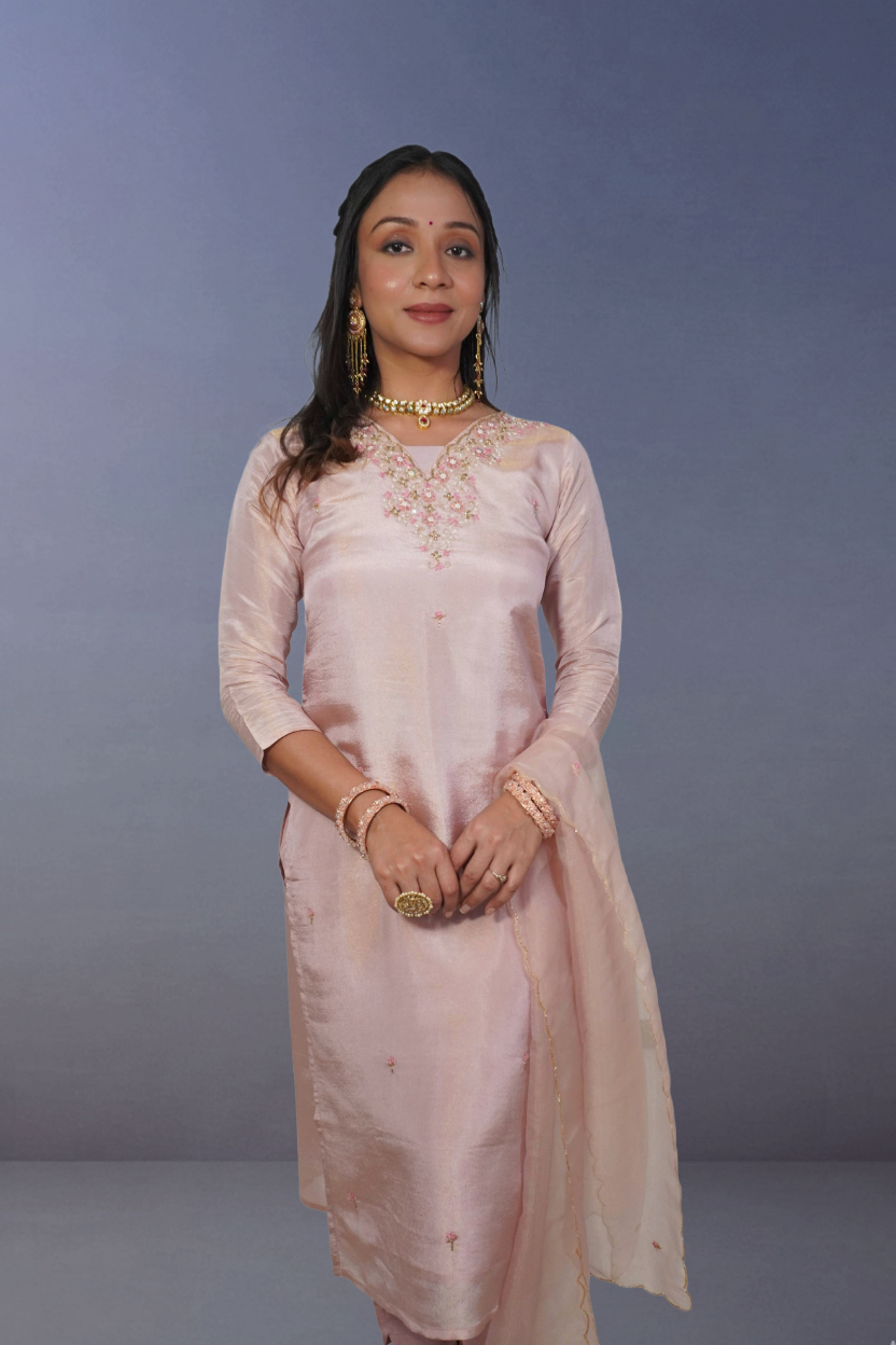 Rose Petal Blush: Hand-Embroidered Pastel Pink Suit Set with Scalloped Dupatta