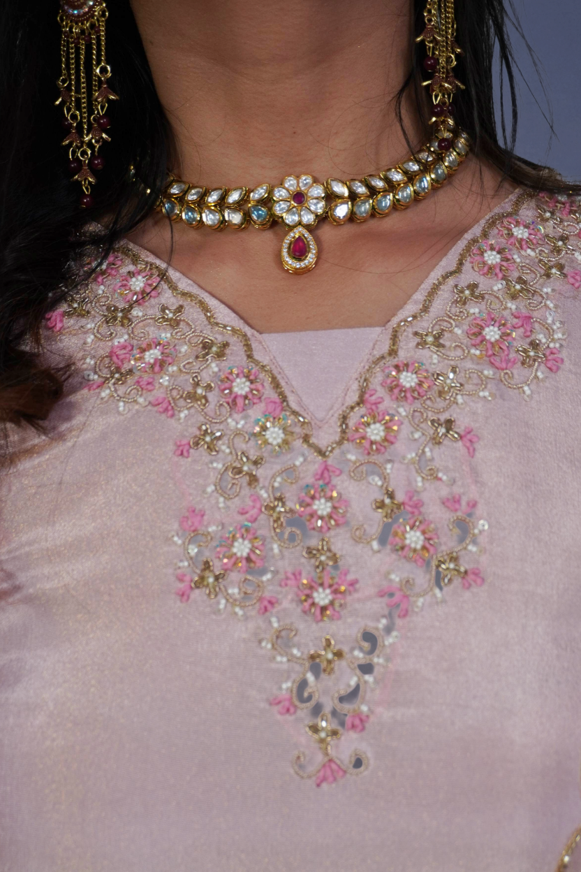 Embrace ethereal elegance with our Rose Petal Blush ensemble. This set is the epitome of "minimalist luxury," designed for the woman who appreciates delicate details and a soft, sophisticated palette. Perfect for daytime weddings, engagement ceremonies, or festive high teas, this outfit radiates a gentle, luminous charm.